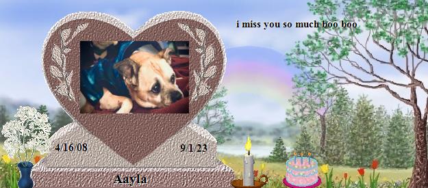 I am so sorry to hear about your loss of Aayla. Please find comfort in knowing that Aayla is now at Rainbows Bridge and making lots of friends. Saying goodbye is never easy. I also lost my precious cat Spooky July 30th, 2001, after 16 wonderful years with her. I have lost several babies since Spooky's passing. Hannah 1/11/13, Sammi 8/2/13, Maci 4/9/14, Gabbi 3/20/17, Zoe 1/3/18, Willow 6/4/18, Shelby 6/12/18, Bear 11/17/19, Bella and Murphy who were both tragically poisoned on 06/18/20, Firefly 12/20/22, Zachary 02/19/23 and Tanner 02/22/24. I am sure that Aayla and my babies have all become good friends. You can visit with Spooky at: http://www.rainbowsbridge.com/residents/Spook002/resident.HTM Take Care, Susan