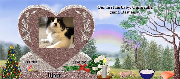I am so sorry to hear about your loss of Bjorn. Please find comfort in knowing that Bjorn is now at Rainbows Bridge and making lots of friends. Saying goodbye is never easy. I also lost my precious cat Spooky July 30th, 2001, after 16 wonderful years with her. I have lost several babies since Spooky's passing. Hannah 1/11/13, Sammi 8/2/13, Maci 4/9/14, Gabbi 3/20/17, Zoe 1/3/18, Willow 6/4/18, Shelby 6/12/18, Bear 11/17/19, Bella and Murphy who were both tragically poisoned on 06/18/20, Firefly 12/20/22, and Zachary 02/19/23. I am sure that Bjorn and my babies have all become good friends. You can visit with Spooky at: http://www.rainbowsbridge.com/residents/Spook002/resident.HTM Take Care, Susan