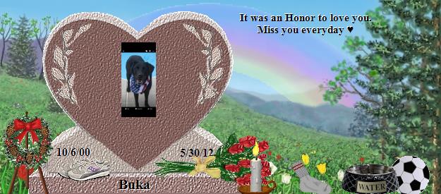 I am so sorry to hear about your loss of Buka. Please find comfort in knowing that Buka is now at Rainbows Bridge and making lots of friends. Saying goodbye is never easy. I also lost my precious cat Spooky July 30th, 2001, after 16 wonderful years with her. I have lost several babies since Spooky's passing. Hannah 1/11/13, Sammi 8/2/13, Maci 4/9/14, Gabbi 3/20/17, Zoe 1/3/18, Willow 6/4/18, Shelby 6/12/18, Bear 11/17/19, Bella and Murphy who were both tragically poisoned on 06/18/20, Firefly 12/20/22, and Zachary 02/19/23. I am sure that Buka and my babies have all become good friends. You can visit with Spooky at: http://www.rainbowsbridge.com/residents/Spook002/resident.HTM Take Care, Susan