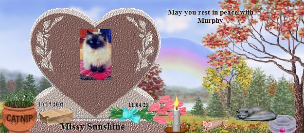 Dear Missy Sunshine, how purrfectly beautiful you are! Please go to the Bridge and purr your precious love down the Rainbow straight into the hearts of your mommy and daddy who miss you so much, and they will send their love right back to you on angels' wings. Dear Nikki and Ed, your world has lost a very special furpurrson, family member and friend, and heaaven has welcomed Home a very special soul. Missy, along with Murphy, is now your very own angel, watching over and for you, just as Jackie, Callie, Tashi, Katy and BG are watching over us, until you meet again and cross the Bridge together. May their sweet presence continually nuzzle your hearts until then, and may you find comfort in knowing that the silver thread of love that binds you heart to heart with Missy and Murphy will never be broken. Many blessings and much peace, Clare and Martha...Please visit our Jackie at https://www.rainbowsbridge.com/residents/JACKI010/resident.HTM