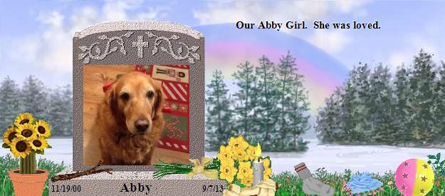 Dear Abby, you are truly cherished! Please go to the Bridge and send your precious love down the Rainbow straight into the hearts of your mom and all your family who miss you so much, and they will send their love right back to you on angels' wings. Annette, your world has lost a very special furperson, family member and friend, and heaven has welcomed home a very special soul. Abby, along with Sadie, is now your very own angel, watching over and for you, just as Tashi, Katy and BG are watching over us, until you meet again and cross the Bridge together. May their sweet love continually hug your heart until then, and may you find comfort in knowing that the silver thread of love that binds you heart to heart with Abby and Sadie will never be broken. Blessings and peace, Clare and Martha...Please visit our Tashi at http://www.rainbowsbridge.com/residents/TASHI002/resident.HTM