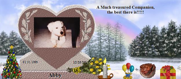 Dear Abby, you are truly beautiful. Please go to the Bridge and send your precious love down the Rainbow straight into the heart of Susan who misses you so much, and she will send her love right back to you on angels' wings. Dear Susan, your world has lost a very special furperson, family member and friend, and heaven has welcomed Home a very special soul. Abby is now your very own angel, watching over and for you, just as Callie, Tashi, Katy and BG are watching over us, until you meet again and cross the Bridge together. May her sweet presence continually nuzzle your heart until then, and may you find comfort in knowing that the silver thread of love that binds you heart to heart with Abby will never be broken. Many blessings and much peace, Clare and Martha...Please visit our Callie at http://www.rainbowsbridge.com/residents/CALLI052/resident.HTM