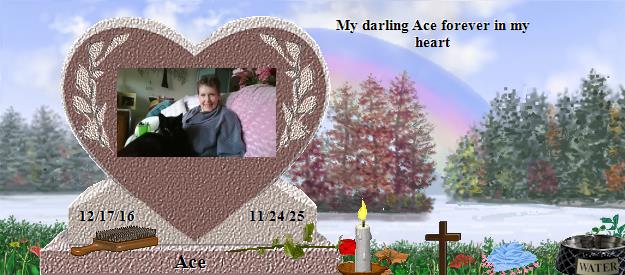 Dear Ace, how purrfectly handsome you are! Please go to the Bridge and purr your precious love down the Rainbow straight into the heart of Linda who misses you so much, and she will send her love right back to you on angels' wings. Dear Linda, your world has lost a very special furpurrson, family member and friend, and heaven has welcomed Home a very special soul. Ace is now your very own angel, watching over and for you, just as Fritz, Jackie, Callie, Tashi, Katy and BG are watching over me, until you meet again and cross the Bridge together. May his sweet presence continually nuzzle your heart until then, and may you find comfort in knowing that the silver thread of love that binds you heart to heart with Ace will never be broken. Many blessings and much peace, Clare...Please visit my Fritz at https://www.rainbowsbridge.com/residents/FRITZ021/resident.htm