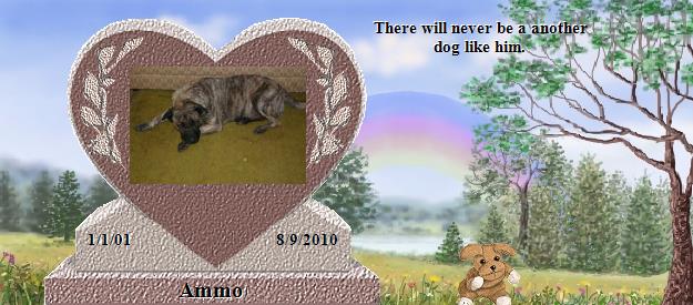 Ammo, What a beautiful baby you were, always so loyal and loving.You taught and gave your daddy so much that he now knows the true meaning of unconditional love. He longs for the day to be able to hold you and to look into your eyes again. I know just how grateful you are for all of love and care in which he provided you. He misses you baby, so very much. I know that you don't want him to be sad for too long, but instead, be happy. For you are happy, content at peace and have been surrounded by so many others who also love and adore you, including my Shayna Girl, Leche and Si. I extend my deepest condolences to you for the loss of Ammo, I know just how painful it is to have lost your angel, for, I too, lost mine. Please vist my Shayna Girl at: http://rainbowsbridge.com/residents/SHAYN005/Resident.htm. My thoughts and prayers are with you. Until we are with our babies again. Shayna, Leche and Si's mommy, Lisa
