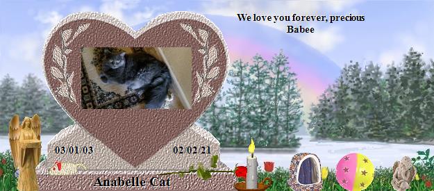 I am so sorry to hear about your loss of Anabelle. Please find comfort in knowing that Anabelle is now at Rainbows Bridge and making lots of friends. Saying goodbye is never easy. I also lost my precious cat Spooky July 30th 2001 after 16 wonderful years with her. I have lost several babies since Spooky's passing. Hannah 1/11/13, Sammi 8/2/13,Maci 4/9/14, Gabbi 3/20/17, Zoe 1/3/18, Willow 6/4/18, Shelby 6/12/18, Bear 11/17/19 and Bella and Murphy who were both tragically poisoned on 06/18/20. I am sure that Anabelle and my babies have all become good friends. You can visit with Spooky at: http://www.rainbowsbridge.com/residents/Spook002/resident.HTM Take Care, Susan