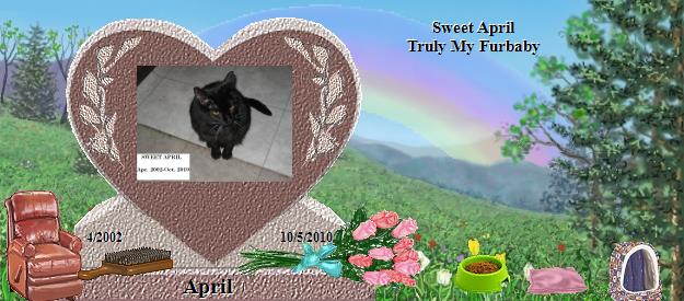 I am so sorry to hear about your loss of April. Please find comfort in knowing that April is now at Rainbows Bridge and making lots of friends. Saying goodbye is never easy. I also lost my precious cat Spooky July 30th 2001 after 16 wonderful years with her. I am sure that April and Spooky have become good friends. You can visit with Spooky at: http://www.rainbowsbridge.com/residents/Spook002/resident.HTM Take Care, Susan
