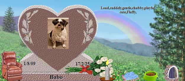 Dear Babo, you are truly handsome. Please go to the Bridge and send your precious love down the Rainbow straight into the hearts of your mamma and pappa who miss you so much, and they will send their love right back to you on angels' wings. Dear Izabella, your world has lost a very special furperson, family member and friend, and heaven has welcomed Home a very special soul. Babo is now your very own angel, watching over and for you, just as Fritz, Jackie, Callie, Tashi, Katy and BG are watching over me, until you meet again and cross the Bridge together. May his sweet presence continually nuzzle your heart until then, and may you find comfort in knowing that the silver thread of love that binds you heart to heart with Babo will never be broken. Many blessings and much peace, Clare...Please visit my Fritz at https://www.rainbowsbridge.com/residents/FRITZ021/resident.htm