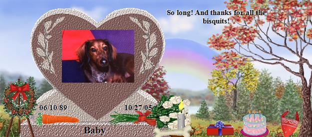 Baby - I can see why your family misses you so much, as you are so, so cute! Send them some kisses and signs from the Rainbow and let them know you are safe, happy, healthy and have made many friends. Let mom and dad know that God has appointed you to be the guardian, protector to watch over them until they are called to the Bridge to join you one day. I will tell my Brande to find you and play with you. I have another baby there just like you, and her hame is Heidi. I hope you have found Heidi and Brande. To Robert and Eve - I send my deepest regrets over the loss of Baby. I too lost my soulmate not long ago, see Brande