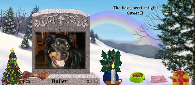 Allison and Jared, I am so very sorry for the loss of your wonderful Bailey. I know the pain you are feeling as I just lost one of my best friends and companions of 16 years, Willy, on January 4, 2011. It hurts so very badly, and I know my tears are still flowing. I know though, that Bailey and Willy are probably playing in the meadows running and jumping now. I know Willy loved the sunshine and I hope that Bailey does too. I truly believe that God would not have made a Heaven without our beloved companions there to meet us. I have left an extra angel to look over Bailey, as she is your angel watching over you. I hope that your pain begins to turn to peace that fills your heart with nothing but wonderful memories. God Bless You until we all meet again. I would love for you to visit Willy at http://.rainbowsbridge.com/residents/WILLY010/ResidentHTM