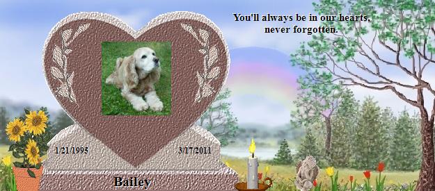 I am so sorry to hear about your loss of Bailey. Please find comfort in knowing that Bailey is now at Rainbows Bridge and making lots of friends. Saying goodbye is never easy. I also lost my precious cat Spooky July 30th 2001 after 16 wonderful years with her. I am sure that Bailey and Spooky have become good friends. You can visit with Spooky at: http://www.rainbowsbridge.com/residents/Spook002/resident.HTM Take Care, Susan
