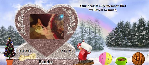 Dear Bandit, you are so gorgeous! Please go to the Bridge and send your precious love down the Rainbow straight into the hearts of your family who miss you so much, and they will send their love right back to you on angels' wings. Cathy, your world has lost a very special furperson, family member and friend, and heaven has welcomed home a very special soul. Bandit is now your very own angel, watching over and for you, just as Tashi, Katy and BG are watching over us, until you meet again and cross the Bridge together. May his sweet love continually hug your heart until then, and may you find comfort in knowing that the silver thread of love that binds you heart to heart with Bandit will never be broken. Blessings and peace, Clare and Martha...Please visit our Tashi at http://www.rainbowsbridge.com/residents/TASHI002/resident.HTM