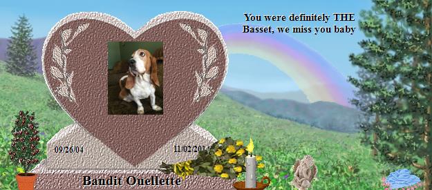 Dear Bandit Ouellette, you are truly gorgeous. Please go to the Bridge and send your precious love down the Rainbow straight into the hearts of your mommy and daddy who miss you so much, and they will send their love right back to you on angels' wings. Dear Rich and Lynne, your world has lost a very special furperson, family member and friend, and heaven has welcomed Home a very special soul. Bandit is now your very own angel, watching over and for you, just as Tashi, Katy and BG are watching over us, until you meet again and cross the Bridge together. May his sweet love continually nuzzle your hearts until then, and may you find comfort in knowing that the silver thread of love that binds you heart to heart with Bandit will never be broken. Many blessings and much peace, Clare and Martha...Please visit our Tashi at http://www.rainbowsbridge.com/residents/TASHI002/resident.HTM