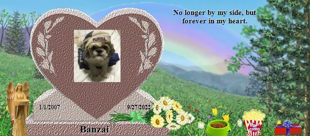 Dear Banzai, you are truly handsome. Please go to the Bridge and send your precious love down the Rainbow straight into the heart of your mommy who misses you so much, and she will send her love right back to you on angels' wings. Dear Jackie, your world has lost a very special furperson, family member and friend, and heaven has welcomed Home a very special soul. Banzai is now your very own angel, watching over and for you, just as Jackie, Callie, Tashi, Katy and BG are watching over us, until you meet again and cross the Bridge together. May his sweet presence continually nuzzle your heart until then, and may you find comfort in knowing that the silver thread of love that binds you heart to heart with Banzai will never be broken. Many blessings and much peace, Clare and Martha...Please visit our Jackie at https://www.rainbowsbridge.com/residents/JACKI010/resident.HTM
