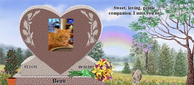Dear Beau, you are truly cherished! Please go to the Bridge and purr your precious love down the Rainbow straight into the heart of your mommy who misses you so much, and she will send her love right back to you on angels' wings. Joan, your world has lost a very special furpurrson, family member and friend, and heaven has welcomed home a very special soul. Beau is now your very own angel, watching over and for you, just as Tashi, Katy and BG are watching over us, until you meet again and cross the Bridge together. May his sweet love continually nuzzle your heart until then, and may you find comfort in knowing that the silver thread of love that binds you heart to heart with Beau will never be broken. Blessings and peace, Clare and Martha...Please visit our Tashi at http://www.rainbowsbridge.com/residents/TASHI002/resident.HTM
