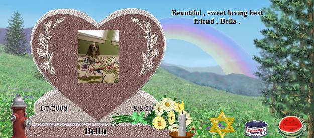 Dear Bella, you are truly beautiful. Please go to the Bridge and send your precious love down the Rainbow straight into the hearts of your mom and dad who miss you so much, and they will send their love right back to you on angels' wings. Dear Bonnie and Ilan, your world has lost a very special furperson, family member and friend, and heaven has welcomed Home a very special soul. Bella is now your very own angel, watching over and for you, just as Callie, Tashi, Katy and BG are watching over us, until you meet again and cross the Bridge together. May her sweet presence continually nuzzle your hearts until then, and may you find comfort in knowing that the silver thread of love that binds you heart to heart with Bella will never be broken. Many blessings and much peace, Clare and Martha...Please visit our Callie at http://www.rainbowsbridge.com/residents/CALLI052/resident.HTM