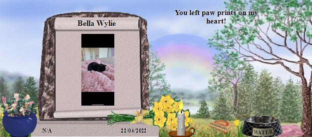 Dear Bella Wylie, how purrfectly beautiful you are! Please go to the Bridge and purr your precious love down the Rainbow straight into the heart of your mommy who misses you so much, and she will send her love right back to you on angels' wings. Dear Danielle, your world has lost a very special furpurrson, family member and friend, and heaven has welcomed Home a very special soul. Bella is now your very own angel, watching over and for you, just as Jackie, Callie, Tashi, Katy and BG are watching over us, until you meet again and cross the Bridge together. May her sweet presence continually nuzzle your heart until then, and may you find comfort in knowing that the silver thread of love that binds you heart to heart with Bella will never be broken. Many blessings and much peace, Clare and Martha...Please visit our Jackie at https://www.rainbowsbridge.com/residents/JACKI010/resident.HTM