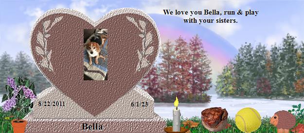 Chris and Shauna, Losing our beloved companions is among life's most difficult trials. Wishing you peace and comfort as you mourn Bella's passing.