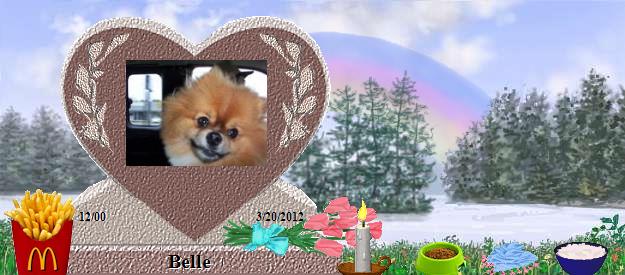 Dear Mary, she's beautiful and precious in every way. What a wonderful blessing that Belle came into your life many years ago and brought such love and companionship. Though it breaks our hearts when our little furbabies grow old and leave us for heaven's most beautiful meadow, we must always know that they have gone to a happy place where they are young and well again. Sweet Belle now plays like a puppy in heavenly sunshine. She roams, chases, woof-woofs, cuddles and naps with her many new furfriends, knowing all along that she will be reunited with her earthly family someday. My two kitties, Inky and Bubba Lou, were there to welcome Belle to the rainbow meadow and I am sure my kitties are enchanted with her sweet personality and her smile. We will see our babies again someday, never to be parted for all of eternity. I wish you blessings of healing and peace, dear friend. You were, and always will be, a wonderful mommy to Belle. I understand and care. Jane