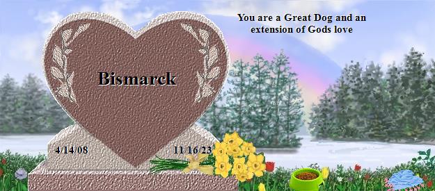 Dear John, I am so sorry for the loss of your precious, loved, special, and dearly missed Bismarck. Yes, he is an extension of God as I feel they all are, that is why God named them the backward of his own name. I will keep you in thought and prayer.
