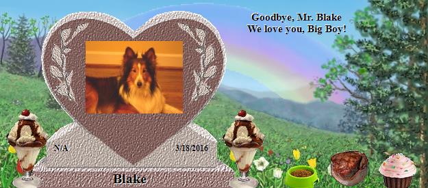 Dear Blake, you are truly handsome. Please go to the Bridge and send your precious love down the Rainbow straight into the hearts of your mom and dad who miss you so much, and they will send their love right back to you on angels' wings. Dear Ritz and Carrie, your world has lost a very special furperson, family member and friend, and heaven has welcomed Home a very special soul. Blake, along with your other precious ones, is now your very own angel, watching over and for you, just as Tashi, Katy and BG are watching over us, until you meet again and cross the Bridge together. May their sweet love continually nuzzle your hearts until then, and may you find comfort in knowing that the silver thread of love that binds you heart to heart with Mr. Blake and the others, will never be broken. Many blessings and much peace, Clare and Martha...Please visit our Tashi at http://www.rainbowsbridge.com/residents/TASHI002/resident.HTM