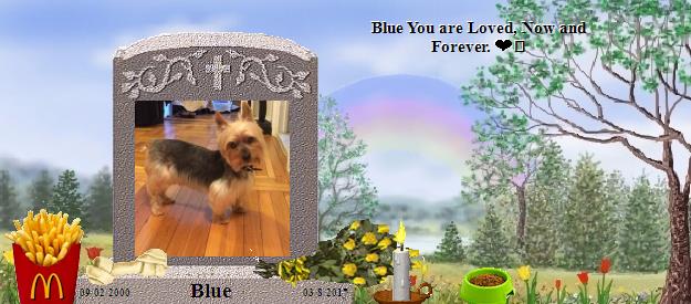 I am so sorry to hear about your loss of Blue. Please find comfort in knowing that Blue is now at Rainbows Bridge and making lots of friends. Saying goodbye is never easy. I also lost my precious cat Spooky July 30th 2001 after 16 wonderful years with her. On January 11, 2013, I lost my faithful friend Hannah who was a beautiful blue tick hound dog. On August 2, 2013 another one of my beautiful cats, Sammi, a black and white tabby, went to Rainbows Bridge. April 9, 2014, Maci, my English Bulldog passed over to Rainbows Bridge. Maci and Hannah were best friends. I am sure that Blue and my babies have all become good friends. You can visit with Spooky at: http://www.rainbowsbridge.com/residents/Spook002/resident.HTM Take Care, Susan