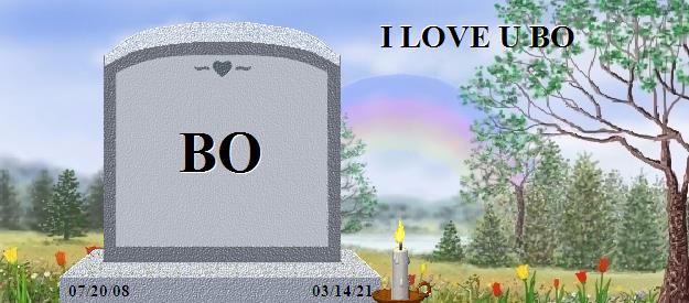 Dear Bo, you are truly cherished. Please go to the Bridge and send your precious love down the Rainbow straight into the heart of your mom who misses you so much, and she will send her love right back to you on angels' wings. Dear Donna, your world has lost a very special furperson, family member and friend, and heaven has welcomed Home a very special soul. Bo is now your very own angel, watching over and for you, just as Jackie, Callie, Tashi, Katy and BG are watching over us, until you meet again and cross the Bridge together. May his sweet presence continually nuzzle your heart until then, and may you find comfort in knowing that the silver thread of love that binds you heart to heart with Bo will never be broken. Many blessings and much peace, Clare and Martha...Please visit our Jackie at https://www.rainbowsbridge.com/residents/JACKI010/resident.HTM