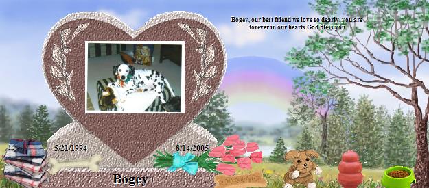 Bogey - what a sweetheart you were to the family! Send them some kisses from the Rainbow to let them know that you are safe, happy, healthy and have made many fur friends. Let mom and dad know that God has appointed you to be their guardian, protector to watch over them until they are called to the Bridge to join you one day. I will tell my Brande to find you and play with you. To Judy - I send my sincere regrets over the loss of Bogey. I too lost my soulmate not long ago, see Brande