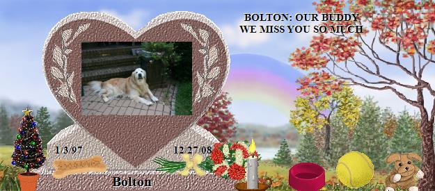 Bolton, What a precious baby you were, always so loyal and loving. You taught and gave your mommy so much that she now knows the true meaning of unconditional love. She longs for the day to be able to hold you and to look into your eyes again. I know just how grateful you are for all of love and care in which she provided you. She misses you baby, so very much. I know that you don't want her to be sad for too long, but instead, be happy. For you are happy, content at peace and have been surrounded by so many others who also love and adore you, including my Shayna Girl and Leche. I extend my deepest condolences to you for the loss of Bolton. I know just how painful it is to have lost your angel, for, I too, lost mine. Please vist my Shayna Girl at: http://rainbowsbridge.com/residents/SHAYN005/Resident.htm and Leche at http://www.rainbowbridge.com/residents/LECHE001/Resident.htm My thoughts and prayers are with you. Until we are with our babies again. Shayna and Leche's mommy, Lisa
