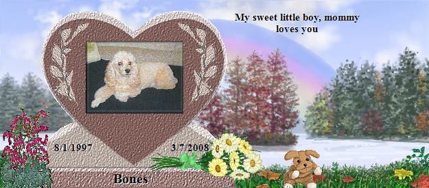 Dear Mary and Family, I know exactly how you feel. I had to let my Maxwell go also just a month before you endured that awful task. Max was having seizures, the last of which left him unable to stay on his little feet. He was nearly blind from the diabetes. Your Bones having cancer was devasting in the same way. That day was the worst in my life too. I felt so guilty and my heart was literally broken as I am sure that yours was as well. May God Bless you and your sweet, beautiful Bones. I have lost my parents, a brother, and my beloved husband. But along with Max, I know I will be rejoined with them all one glorious day. With belief in our Lord, you can be assured that you and your loved ones will be also. I love frogs. FROG spells "Fully Rely on God." Bear this in mind and you and Bones will cross the bridge together on another glorious day as well. "May God Bless you, pretty little Bones!!"