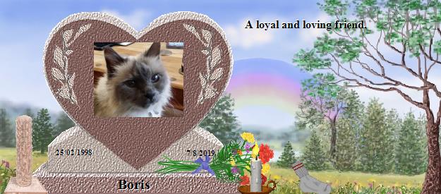 Dear Boris, how purrfectly handsome you are! Please go to the Bridge and purr your precious love down the Rainbow straight into the hearts of your mummy and daddy who miss you so much, and they will send their love right back to you on angels' wings. Dear David and Penny, your world has lost a very special furpurrson, family member and friend, and heaven has welcomed Home a very special soul. Boris is now your very own angel, watching over and for you, just as Tashi, Katy and BG are watching over us, until you meet again and cross the Bridge together. May his sweet presence continually nuzzle your hearts until then, and may you find comfort in knowing that the silver thread of love that binds you heart to heart with Boris will never be broken. Many blessings and much peace, Clare and Martha...Please visit our Tashi at http://www.rainbowsbridge.com/residents/TASHI002/resident.HTM