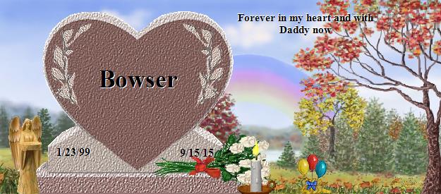 Dear Bowser, you are truly cherished. Please go to the Bridge and send your precious love down the Rainbow straight into the hearts of your mom and dad who miss you so much, and they will send their love right back to you on angels' wings. Dear Deb and Mike, your world has lost a very special furperson, family member and friend, and heaven has welcomed Home a very special soul. Bowser is now your very own angel, watching over and for you, just as Tashi, Katy and BG are watching over us, until you meet again and cross the Bridge together. May his sweet love continually nuzzle your hearts until then, and may you find comfort in knowing that the silver thread of love that binds you heart to heart with Bowser will never be broken. Many blessings and much peace, Clare and Martha...Please visit our Tashi at http://www.rainbowsbridge.com/residents/TASHI002/resident.HTM