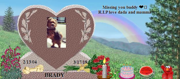 I am so sorry to hear about your loss of Brady. Please find comfort in knowing that Brady is now at Rainbows Bridge and making lots of friends. Saying goodbye is never easy. I also lost my precious cat Spooky July 30th 2001 after 16 wonderful years with her. On January 11, 2013, I lost my faithful friend Hannah who was a beautiful blue tick hound dog. On August 2, 2013 another one of my beautiful cats, Sammi, a black and white tabby, went to Rainbows Bridge. April 9, 2014, Maci, my English Bulldog passed over to Rainbows Bridge. Maci and Hannah were best friends. On March 20, 2017 my sweet little calico Gabbi crossed over Rainbow's Bridge. I adopted her about a month after Spooky passed away and Gabbi also lived to be almost 16 years old. On 1/3/18 my little cat Zoe passed away. I am sure that Brady and my babies have all become good friends. You can visit with Spooky at: http://www.rainbowsbridge.com/residents/Spook002/resident.HTM Take Care, Susan