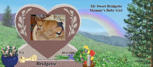 Good Morning Bridgete, What a pretty girl you are. Welcome to the Bridge, and now you are offically a Bridgekid. You will meet Bear the horse, Hotrod, ET, Mellow the cats, Ozzie and Cyrano the service dogs. What great company you are in. You have a very special job to do now, and that is to let your mom know that all is well with you, and how much you love her every day. Now, run fast, play hard, and love always. Cheryl aka Cyrano's mom