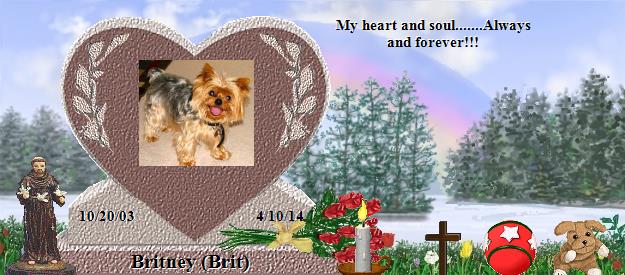 THIS MADE ME CRY TRACEY. BEAUTIFUL WORDS. YOU WERE THE BEST GIFT THAT BRIT COULD HAVE ASKED FOR, AS SHE WAS FOR YOU. THE KINDEST, MOST LOVING, CARING, NURTURING MOM EVER. YOU DID ALL YOU COULD TO EXTEND HER LIFE, BUT GOD AND ALL THE OTHER ANIMALS NEEDED HER MORE.SHE'S NO LONGER SUFFERING, SHE'S HEALED AND HAVING SO MUCH FUN AND SHE WILL ALWAYS AND FOREVER REMEMBER HOW MUCH YOU LOVED AND CARED FOR HER, DOING SO MUCH TO KEEP HER SAFE, HAPPY & HEALTHY. YOU GAVE HER YOUR ALL. I REMEMBER WHEN I GOT HER, MY FRIENDS WOULD SAY, "YOU GOT A DOG AS HYPER AS YOU", THEY CALLED HER JUMPING BEAN, SHE JUMPED AS HIGH AS THE COUNTER TOPS, ALSO CALLED HER KANGAROO ALWAYS JUMPING AND BOUNCING. SHE BROUGHT US ALL SUCH JOY, MY HEART HURTS FOR YOU, KNOWING HOW MUCH YOU MISS HER, BUT JUST KNOW THAT SHE IS NO LONGER SUFFERING AND SHE IS PLAYING AND HAVING FUN IN A MORE BEAUTIFUL PLACE. WE WILL JOIN HER SOMEDAY WHEN GOD NEEDS US, AND SHE WILL BE SO FULL OF JOY WHEN WE RE-UNITE. SHE WILL ALWAYS BE WITH YOU, XOX