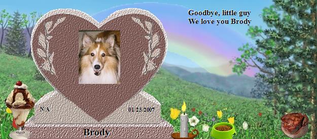 that at least for the short time you had with them, you knew what it was to be loved and gave that back unconditionally.You are now their Guardian Angel, and can take a place in the Heavens as one more brightly shining star. Whisper to Ritz and Carrie, that you shine the brightest with your eternal love for them. My little guy caleb was among the many furbabies eagerly waiting to greet you, so introduce yourself.For some ,we had years of the special bond of love, and others only months, but all that time seemed to only take moments, but what beloved memories we will have . Till you are once again together with your earthly family, rest well, and have peace, for you are once more yuoung,healthy and carefree. Run with the wind, and soar to the clouds, as the sky holds no limits for you now Brody.
