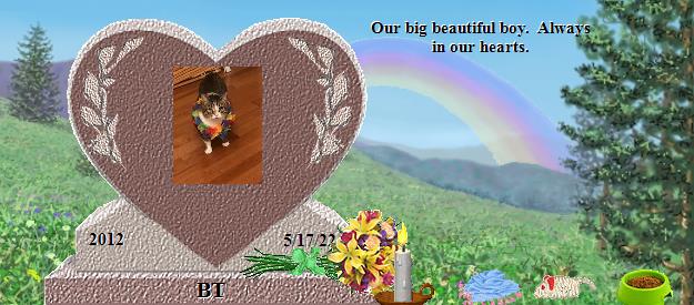 Dear BT, how purrfectly handsome you are! Please go to the Bridge and purr your precious love down the Rainbow straight into the hearts of your family who miss you so much, and they will send their love right back to you on angels' wings. Dear Kim and Colten, your world has lost a very special furpurrson, family member and friend, and heaven has welcomed Home a very special soul. BT is now your very own angel, watching over and for you, just as Jackie, Callie, Tashi, Katy and BG are watching over us, until you meet again and cross the Bridge together. May his sweet presence continually nuzzle your hearts until then, and may you find comfort in knowing that the silver thread of love that binds you heart to heart with BT will never be broken. Many blessings and much peace, Clare and Martha...Please visit our Jackie at https://www.rainbowsbridge.com/residents/JACKI010/resident.HTM