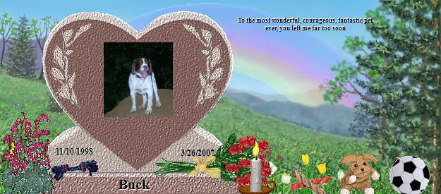 Hello Buck--what a handsome and brave fellow you were for your dad.he loved and misses you very much, and wrote a beautiful tribute for us to share. Be sure to say hi to my little guy Caleb, he was born the same year you were, and blessed me with almost 8 very short years.The emptiness left behind by you and my guy is very hard to fill-and i know if we could have but one wish, your dad and myself would want to have you back in our arms, and get those special doggy kisses we so miss. Buck,now you are in a most magical and wondrous place where you are healthy and young once more--by now you have left your daddy know you are all right, and making so many new friends.You are Franks' Guardian angel now, and one more brightly shining star in the Heavens, whose glow sends the warmth of your eternal love down upon your dad.Cioppis'mom told me and caleb about you, and now it seems you'll be reuniting with Nicki. watch over each other and your families, for you were loved, and that is forever.