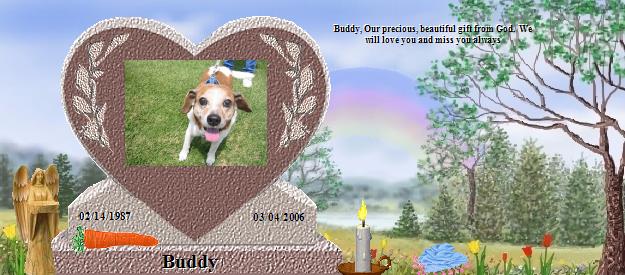 i'm so very, sorry for your loss, for your grief. the pain is horrible. but your love for Buddy is so awesome and so evident. i know that he has joy knowing you still remember him so. and i'm sure he's so proud to have been remembered so wonderfully as you have shown here! i'm glad Buddy's brother is there with you. maybe he can bring a new joy to you that you wouldn't have known if you hadn't braved to let him in your lives. may God Bless you Richly!