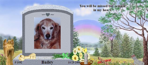 Bailey - How sweet you are and what an angel! Send your Bill some kisses from the Rainbow to let him know that you are safe, happy, healthy and have made many fur friends to play with. Let Bill know that God has appointed you to be his guardian, protector to watch over him until he is called to the Bridge to join you one day. I will tell my Brande to find you and play with you. To Bill - I send my deepest regrets over the loss of Bailey. I too lost my soulmate not long ago, see Brande