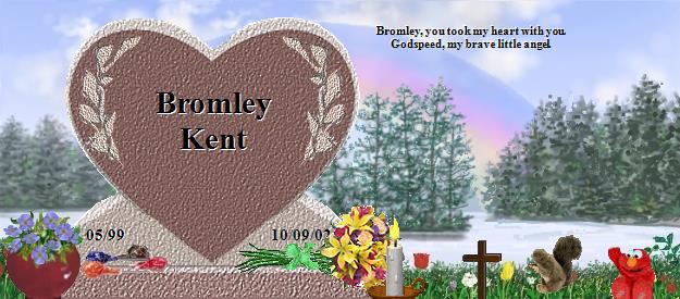 May Bromley Kent's flame continue to gently glow and shine eternally in your heart... My best wishes for a happy Holiday Season this year to you and your entire family, from the Rainbow and beyond, Karen....Dusty's mommy..... http://RainbowsBridge.com/residents/DUSTY101/Resident.htm