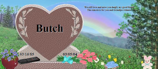 May Butch's flame continue to gently glow and shine eternally in your heart...The poem at Butch's site is one of the most beautiful poems I've ever read....It was very well written, indeed...God Bless...My best wishes for a happy Holiday Season this year to you and your entire family, from the Rainbow and beyond, Karen....Dusty's mommy..... http://RainbowsBridge.com/residents/DUSTY101/Resident.htm