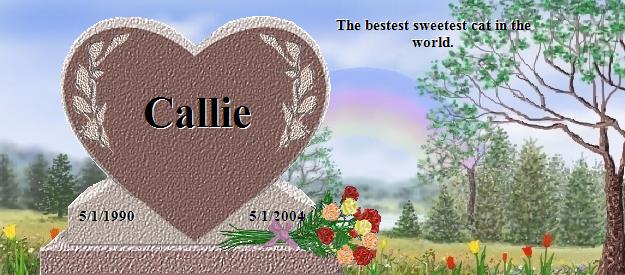 Dear Callie, you are truly cherished. Please go to the Bridge and purr your precious love down the Rainbow straight into the hearts of your mommy and daddy who miss you so much, and they will send their love right back to you on angels' wings. Dear Carole and Gary, your world has lost a very special furpurrson, family member and friend, and heaven has welcomed Home a very special soul. Callie is now your very own angel, watching over and for you, just as Tashi, Katy and BG are watching over us, until you meet again and cross the Bridge together. May her sweet love continually nuzzle your hearts until then, and may you find comfort in knowing that the silver thread of love that binds you heart to heart with Callie will never be broken. Many blessings and much peace, Clare and Martha...Please visit our Tashi at http://www.rainbowsbridge.com/residents/TASHI002/resident.HTM