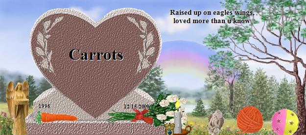 Carrot, What an adorable baby you were, always so loyal and loving.You taught and gave your family so much that they now know the true meaning of unconditional love.They long for the day to be able to hold you and to look into your eyes again.I know just how grateful you are for all of love and care in which she provided you.They miss you baby, so very much. I know that you don't want them to be sad for too long, but instead, be happy. For you are happy, content at peace and have been surrounded by so many others who also love and adore you, including my Shayna Girl and Leche.I extend my deepest condolences to you for the loss of Carrot.I know just how painful it is to have lost your angel, for, I too, lost mine. Please vist my Shayna Girl at: http://rainbowsbridge.com/residents/SHAYN005/Resident.htm and Leche at http://www.rainbowbridge.com/residents/LECHE001/Resident.htm My thoughts and prayers are with you. Until we are with our babies again. Shayna and Leche's mommy, Lisa