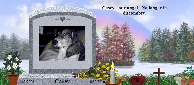 Cutie Baby Casey, Welcome to Rainbow Bridge. I know your playing all day long, running pain free, lying in the sun, running thru the creek under the bridge. Playing fur baby games, and doing anything your little heart desires. Your Mommy misses and loves you very much. What a beautiful place she made for you. Be sure to send signs down to everyone, a butterfly, a soft breeze, and a dream. I will ask my Lilly to find you; She loves all babies(boys)! Play and run baby. You now are Mommy and Daddy’s guardian angel, just as they were your angels while you were here. Dear Cana & Jon, I am sorry for your loss and your past tough couple of months. You did such a wonderful thing for Casey. What a lovely story. You never gave up on him. If we can cherish the time we had while they were with us, until we meet forever, it makes it somewhat bearable. You have lost a wonderful best friend and heaven has gained a lovely new soul. Many prayers to you, Jon & sweet Allison, Debbie/Lillysmommy/sonoma/ca