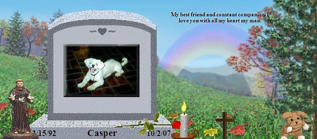 Casper, you are such a beautiful little baby and have such a wonderful mother who misses you so much. Reading your tribute had tears flowing down my face. I have two St. Francis's statues at my house although not one for an urn. Casper, I know you will take care of your mother always until you both are together forever. You are so beautiful.