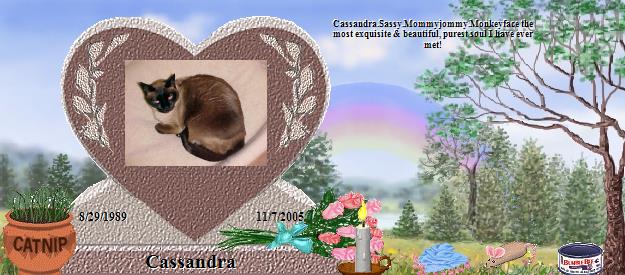 Cassandra - You are a most lovely lady and so pretty a color! Send mom some kisses from the Rainbow to let her know that you are safe, happy, healthy and have many fur friends to play with now. Let Andrea know that God has appointed you to be the guardian, protector to watch over her until she is called to the Bridge to join you one day. I will tell my Brande to find you and play with you. To Andrea - I send my deepest regrets over the loss of Cassandra. I too lost my soulmate not long ago, see Brande