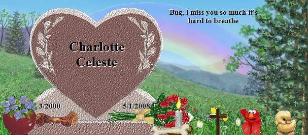 To precious "Bug", a new angel at the Rainbow, with your guardian angel wings soaring in the skies watching over your mommy back here... And I just know by now you & Bromley & Wolf have had the chance to look around for the coziest & softest places to take your sunshine filled Rainbow-colored naps together, haven't you... And each time you all look up and see that wondrously magical Rainbow, may you know that Donna has actually helped make it shine a little brighter. How? With her tears, sweet baby. Each love-drop filled tear here has mixed with the sunshine there at your new home, and your Rainbow shines even brighter for you... An old Indian proverb: "The Soul would have no Rainbow if the Eyes had No Tears" says it best... You now find rest in the Arms of the Angels...what more could your family have ever wished for you? What more could they have ever wished....from Karen, Dusty's mom: http://rainbowsbridge.com/residents/DUSTY101/Resident.htm