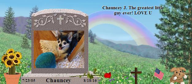 Hi Chauncey my love. Still missing your sweet little self by my side. My little side kick or more like (I was yours) you were always King of the castle. That big bark out of that little body was a force to be reckoned with. I miss hearing it, I miss you all the time, everyday. It brings me comfort to know that you are at home walking besides Jesus in his Grace with Mickey, Timmy, Kenya, Samson, Max & Pee Wee. I know you're all looking out for each other having a blast and watching over us as well. Just know you are never forgotten my sweet boy. Mommy always loves you and carries your spirit with me in my heart. You changed my life. You brought joy to my soul. Your memory lives on within me. Rest peacefully in paradise my love. Love you forever Mommy.