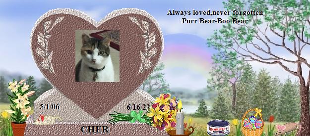 Dear Cher, how purrfectly beautiful you are! Please go to the Bridge and purr your precious love down the Rainbow straight into the heart of your mommy who misses you so much, and she will send her love right back to you on angels' wings. Dear Patricia, your world has lost a very special furpurrson, family member and friend, and heaven has welcomed Home a very special soul. Cher is now your very own angel, watching over and for you, just as Jackie, Callie, Tashi, Katy and BG are watching over us, until you meet again and cross the Bridge together. May her sweet presence continually nuzzle your heart until then, and may you find comfort in knowing that the silver thread of love that binds you heart to heart with Cher will never be broken. Many blessings and much peace, Clare and Martha...Please visit our Jackie at https://www.rainbowsbridge.com/residents/JACKI010/resident.HTM