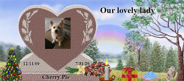 Dear Cherry Pie, you are truly beautiful. Please go to the Bridge and send your precious love down the Rainbow straight into the hearts of your mommy and daddy who miss you so much, and they will send their love right back to you on angels' wings. Dear Edward and Tera, your world has lost a very special furperson, family member and friend, and heaven has welcomed Home a very special soul. Cherry Pie is now your very own angel, watching over and for you, just as Callie, Tashi, Katy and BG are watching over us, until you meet again and cross the Bridge together. May her sweet presence continually nuzzle your hearts until then, and may you find comfort in knowing that the silver thread of love that binds you heart to heart with Cherry Pie will never be broken. Many blessings and much peace, Clare and Martha...Please visit our Callie at http://www.rainbowsbridge.com/residents/CALLI052/resident.HTM